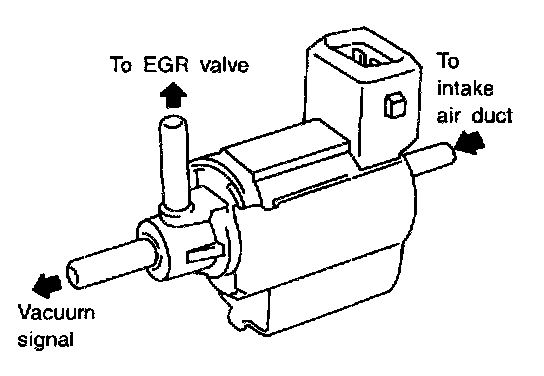 The EGRC-solenoid valve responds to signals from the ECM. When the ECM sends an ON (ground) signal, the coil in the solenoid valve is energized. A plunger will then move to flow the vacuum signal (from the intake manifold collector to the EGR valve.)