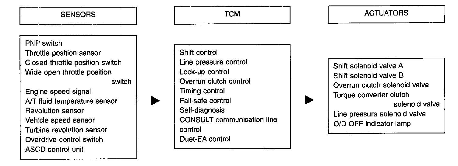 The automatic transmission senses vehicle operating conditions through various sensors. It always controls the optimum shift position and reduces shifting and lock-up shocks.