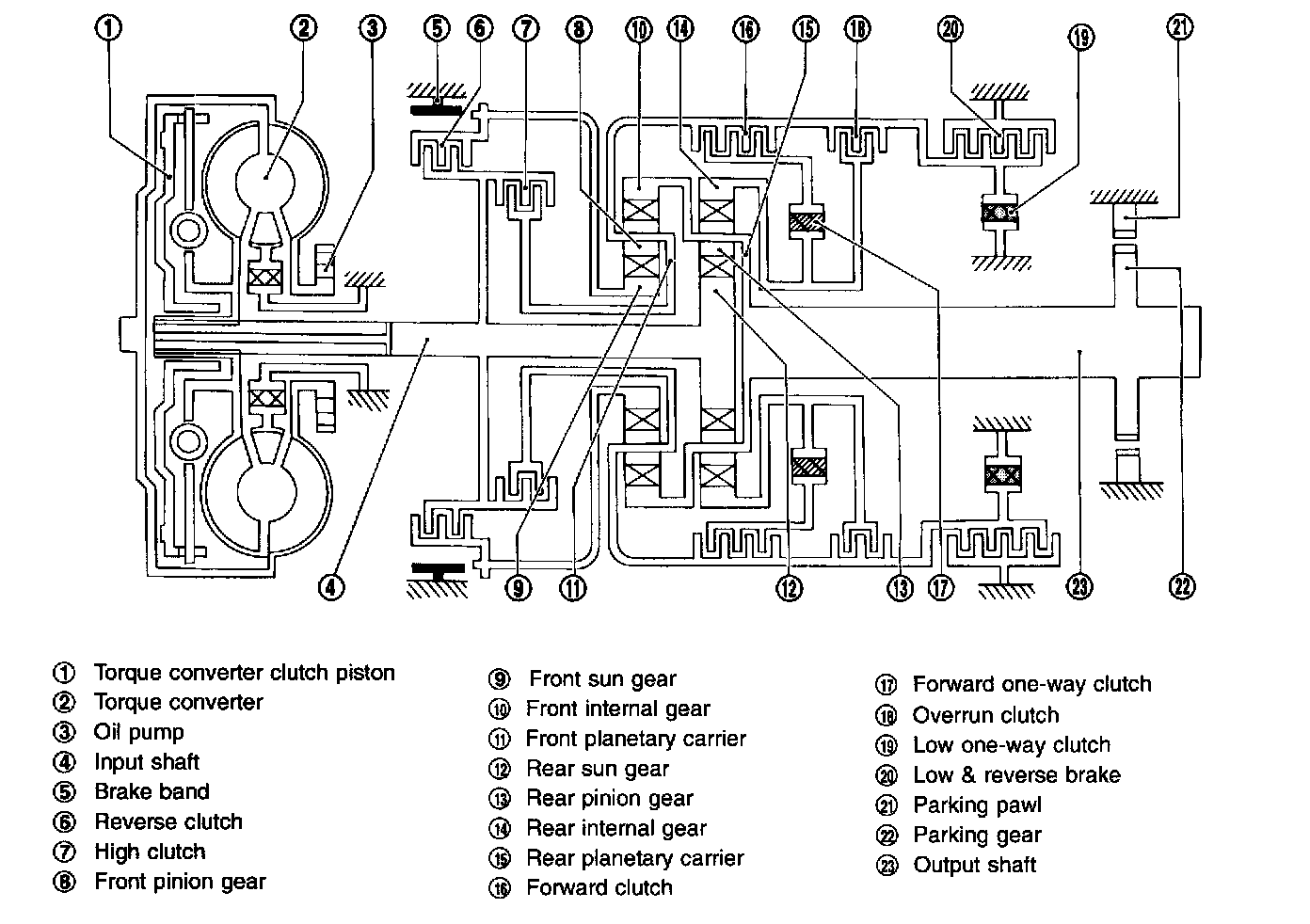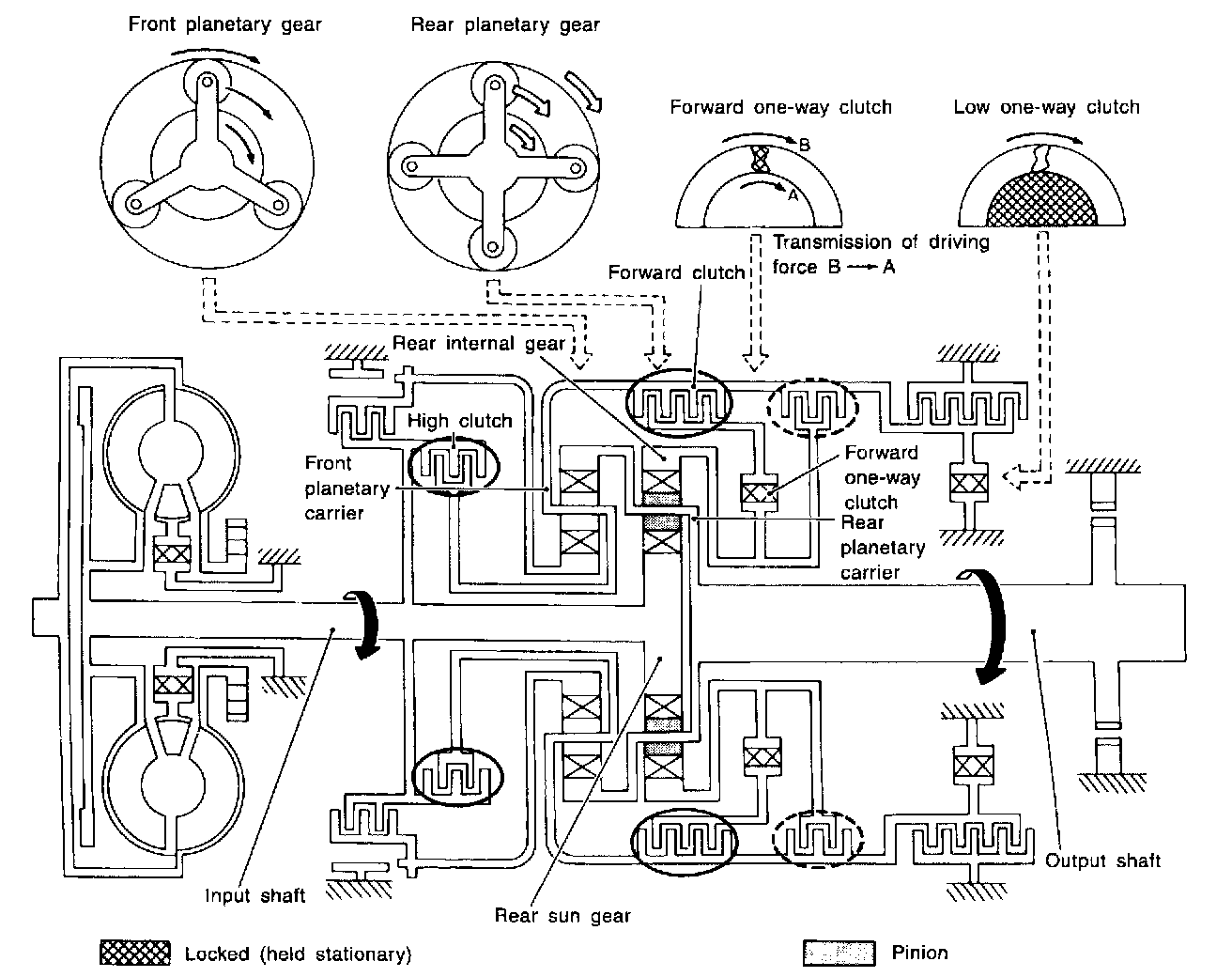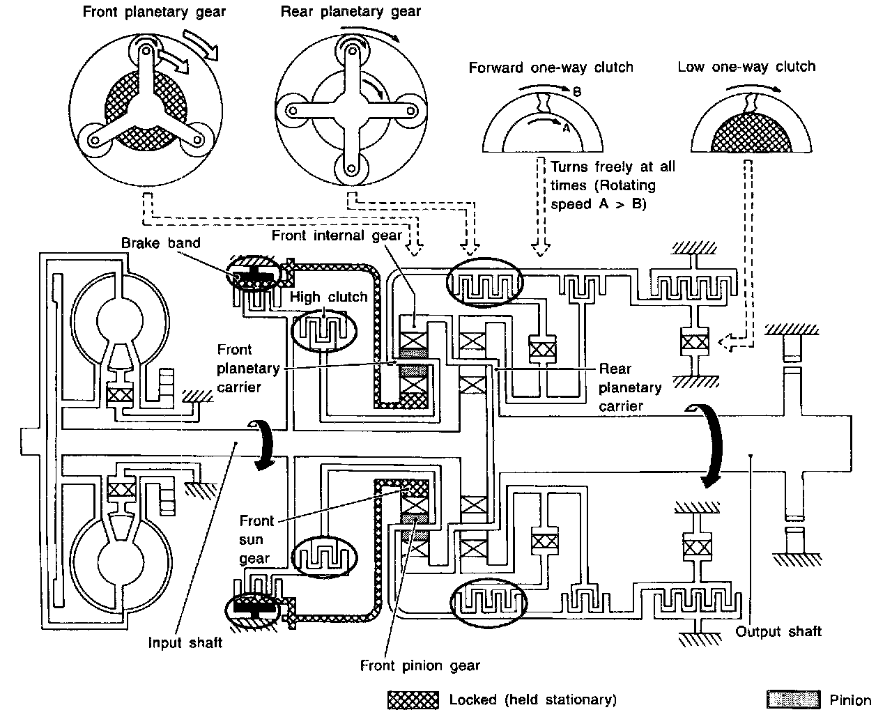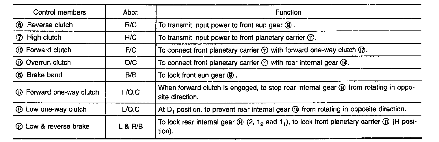 Two one-way clutches are also employed: one is used for the forward clutch and the other for the low clutch. These one-way clutches, combined with four accumulators, reduce shifting shock to a minimum.
