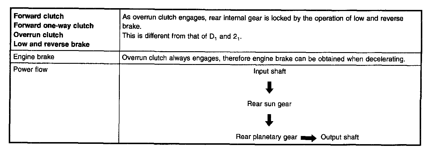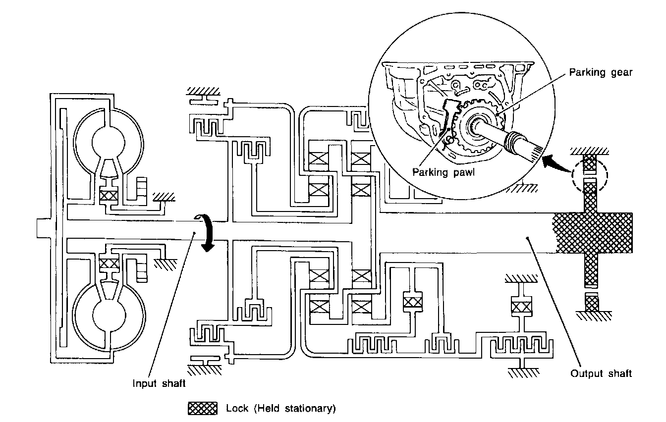 Similar to the "N" position, no control members operate. The parking pawl interconnected with the select lever engages with the parking gear to mechanically hold the output shaft so that the powertrain is locked.