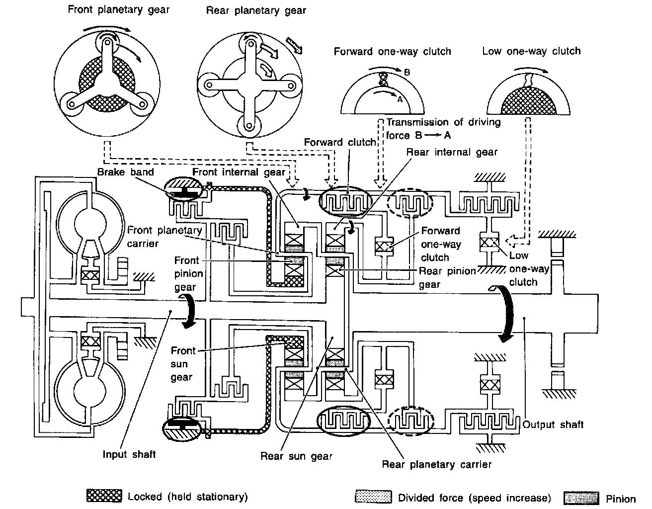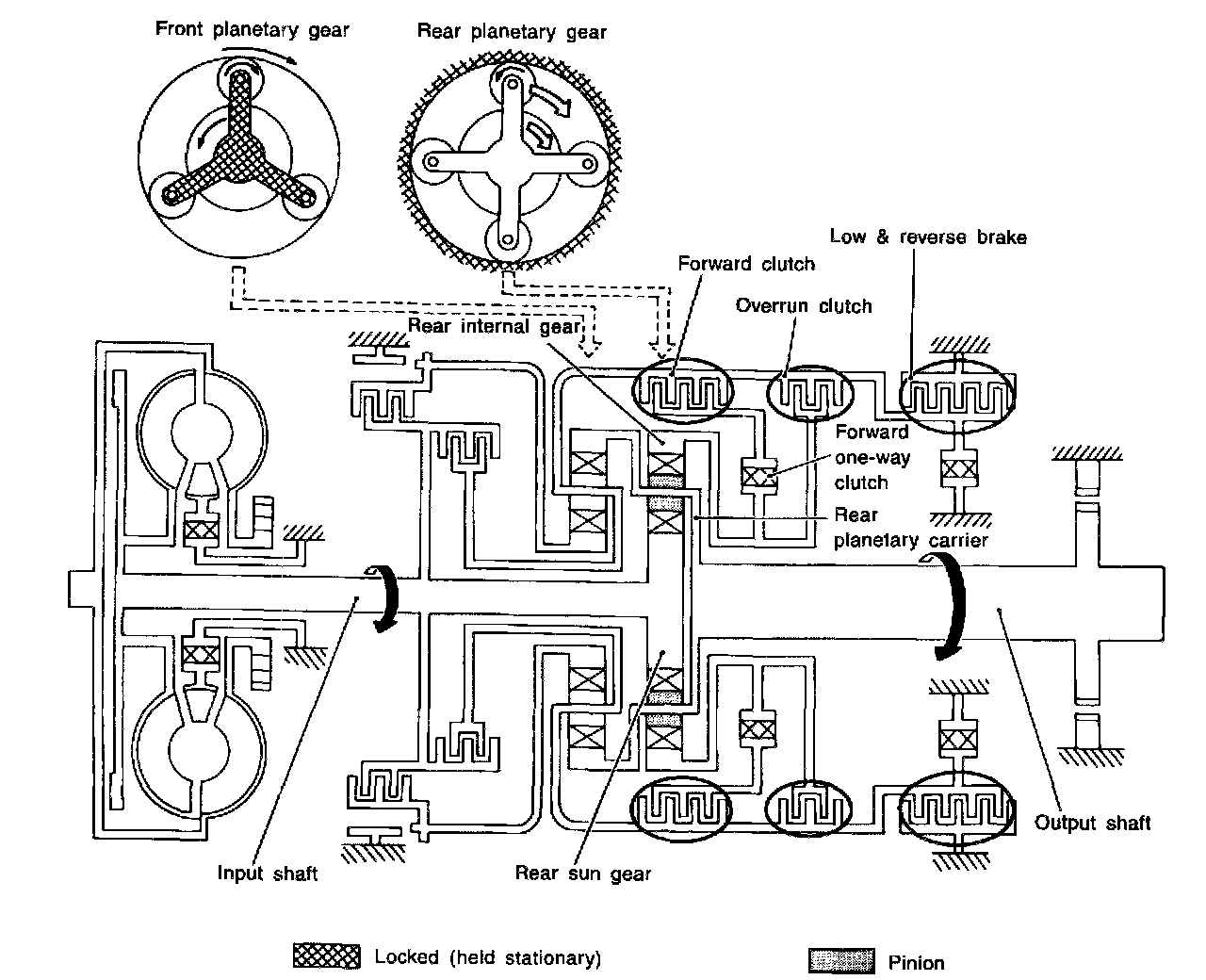 Shift MechanismThe automatic transmission uses compact, dual planetary gear systems to improve power-transmission efficiency, simplify construction and reduce weight.