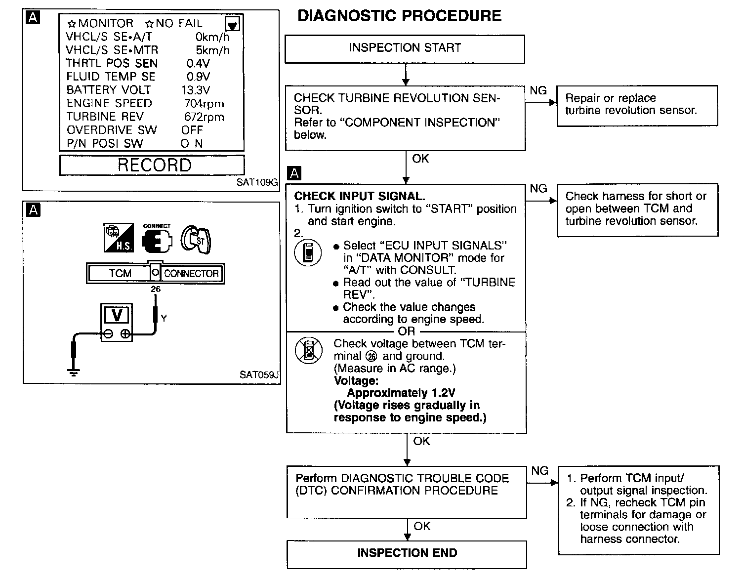 3. Perform self-diagnosis. Refer to TCM SELF-DIAGNOSTIC PROCEDURE (No Tools), Displaying & Reading Trouble Codes