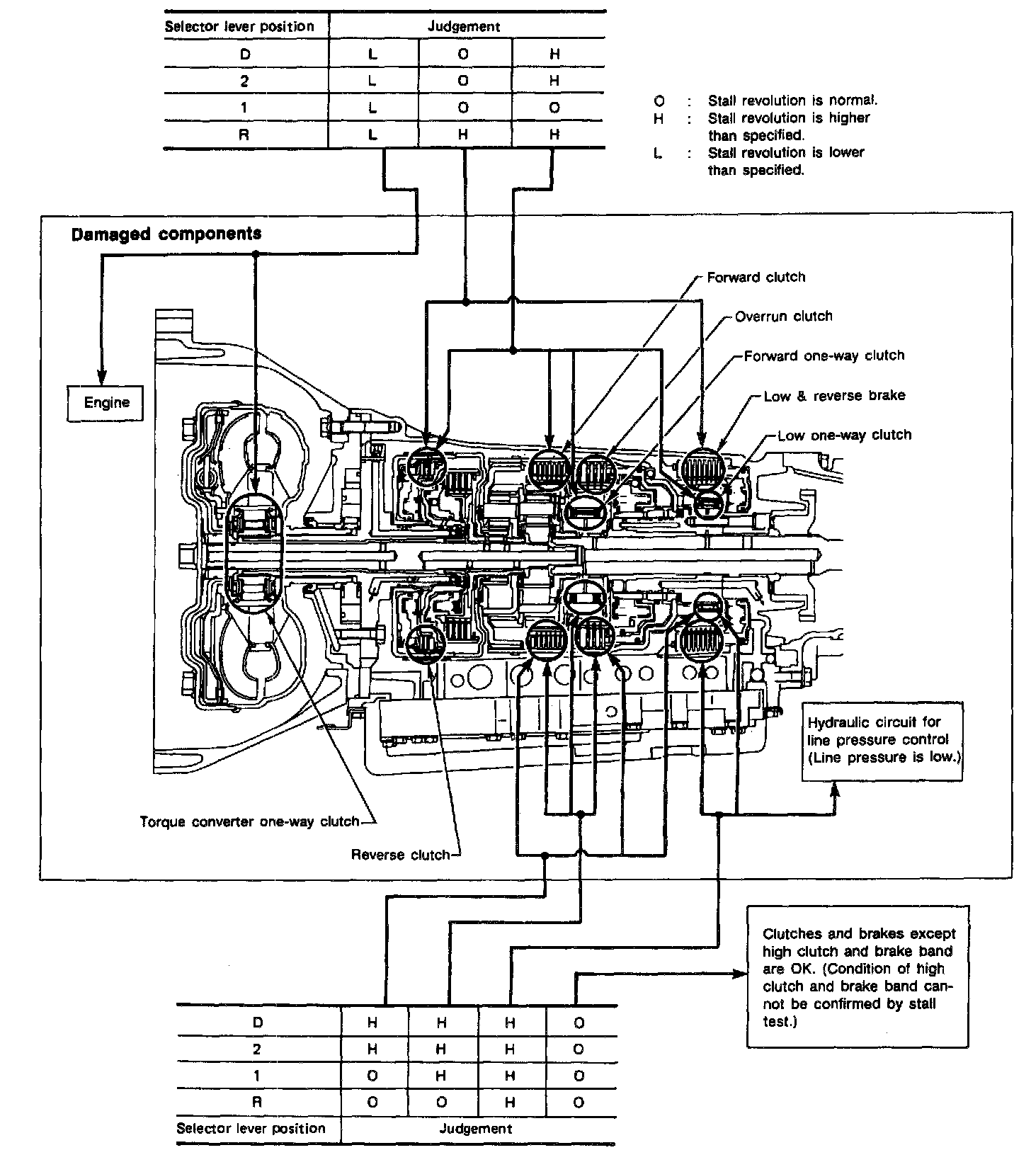 1st and 2nd gears in "2" position and engine brake functions with accelerator pedal released (fully closed throttle) .Forward clutch or forward one-way clutch slippage