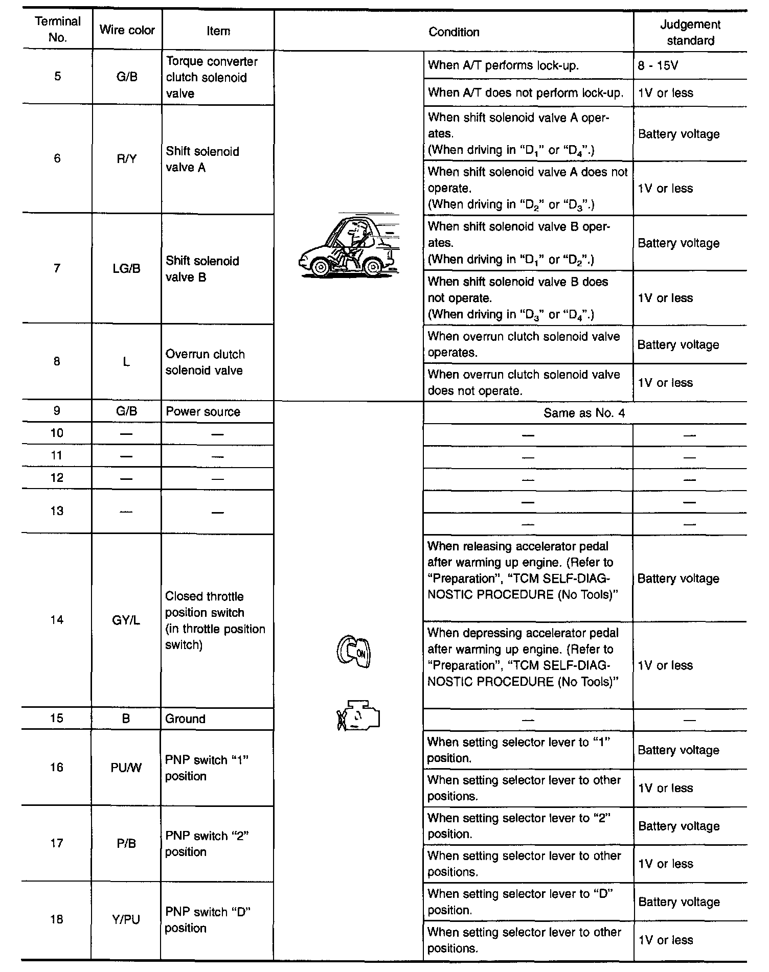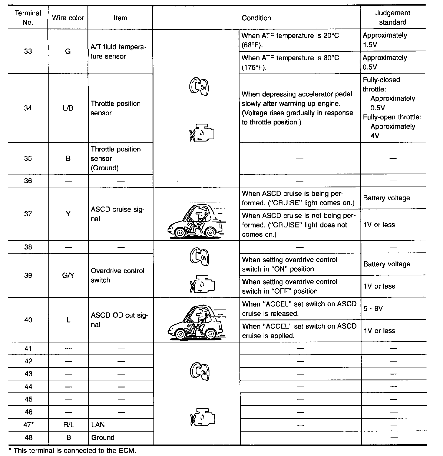 Measure voltage between each terminal and terminal (15) or (48) by following "