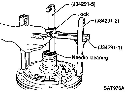 a. With needle bearing installed, place J34291-1 (bridge), J34291-2 (legs) and the J34291-5 (gauging cylinder) onto oil pump. The long ends of legs should be placed firmly on machined surface of oil pump assembly and gauging cylinder should rest on top of the needle bearing. Lock gauging cylinder in place with set screw.