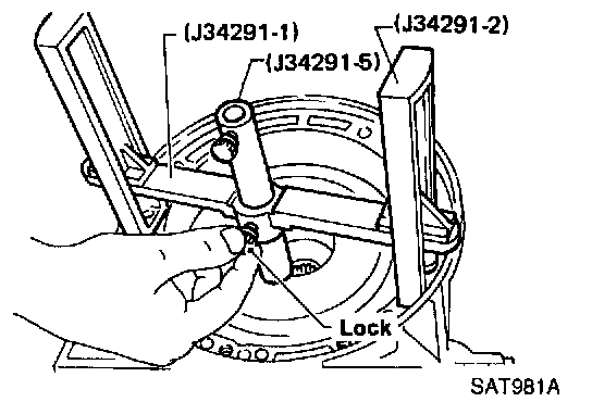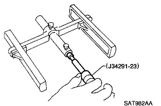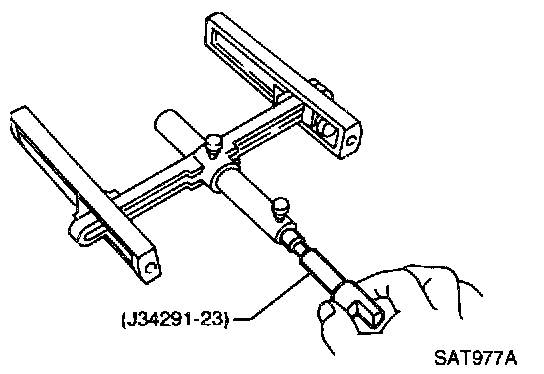a. Place J34291-1 (bridge), J34291-2 (legs) and J34291-5 (gauging cylinder) on machined surface of transmission case (no gasket) and allow gauging cylinder to rest on front thrust surface of reverse clutch drum. Lock cylinder in place with set screw.