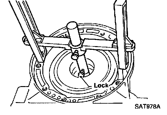 c. With original bearing race installed inside reverse clutch drum, place shim selecting gauge with its legs on machined surface of transmission case (no gasket) and allow gauging plunger to rest on bearing race. Lock gauging plunger in place with set screw.