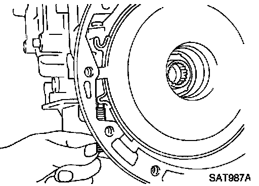 b. Place brake band on periphery of reverse clutch drum, and insert band strut into end of band servo piston stem.