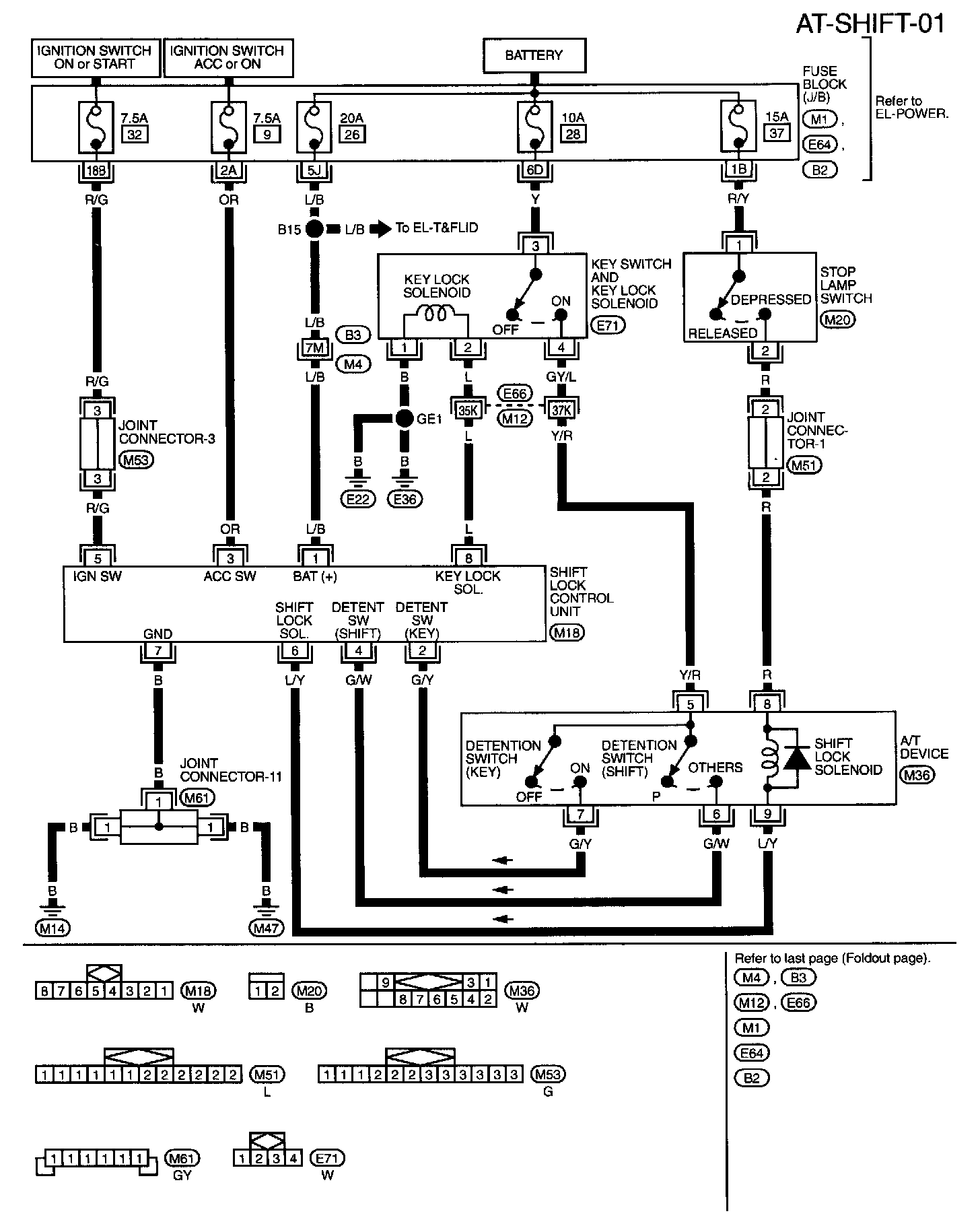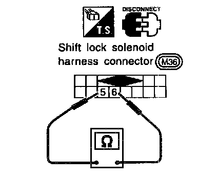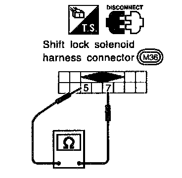 - Check continuity between terminals � and � of shift lock solenoid harness connector.