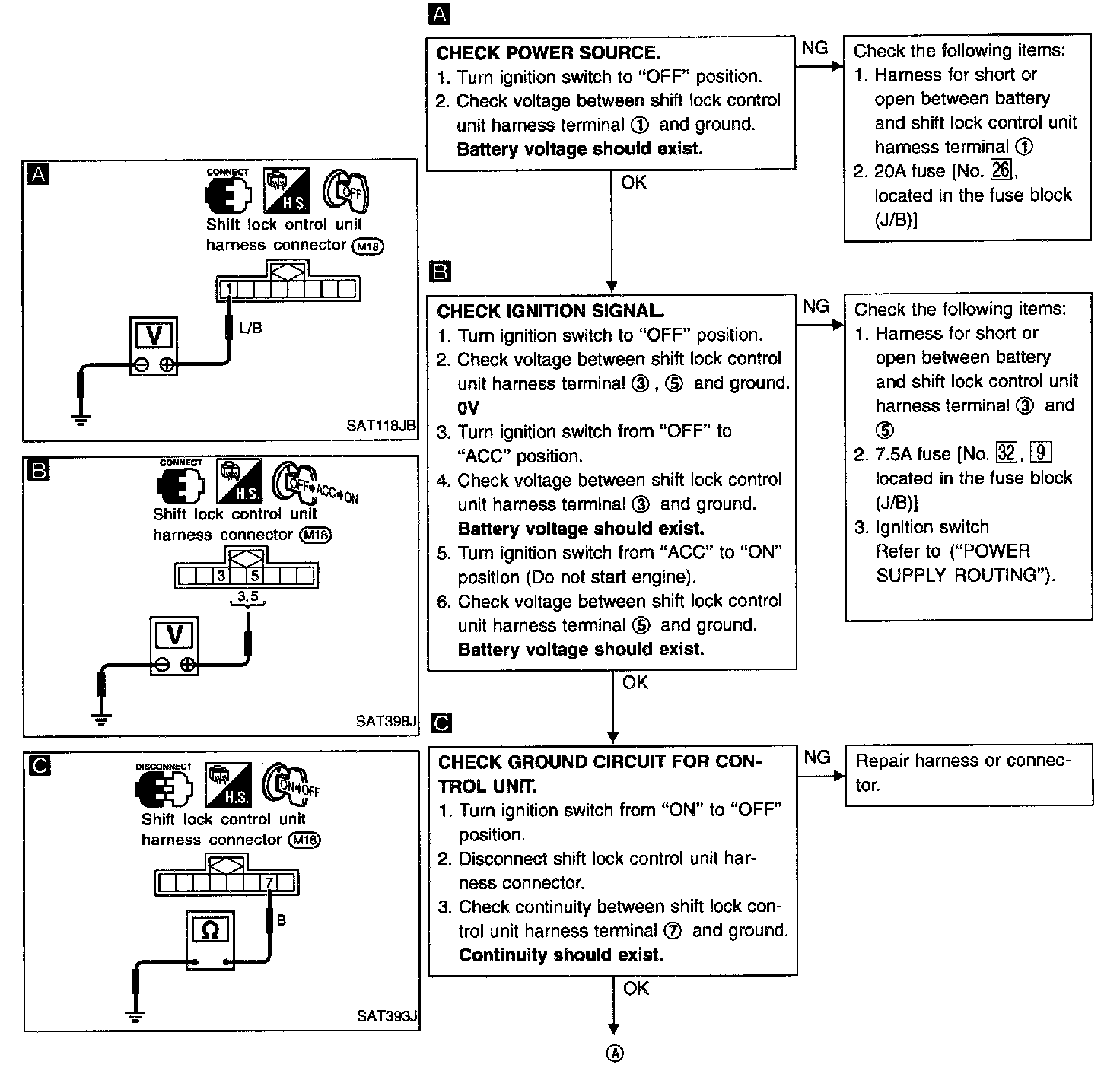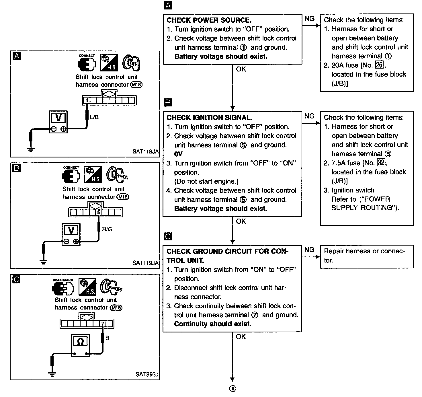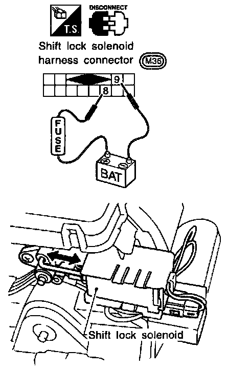 - Check operation by applying battery voltage to shift lock solenoid harness connector.