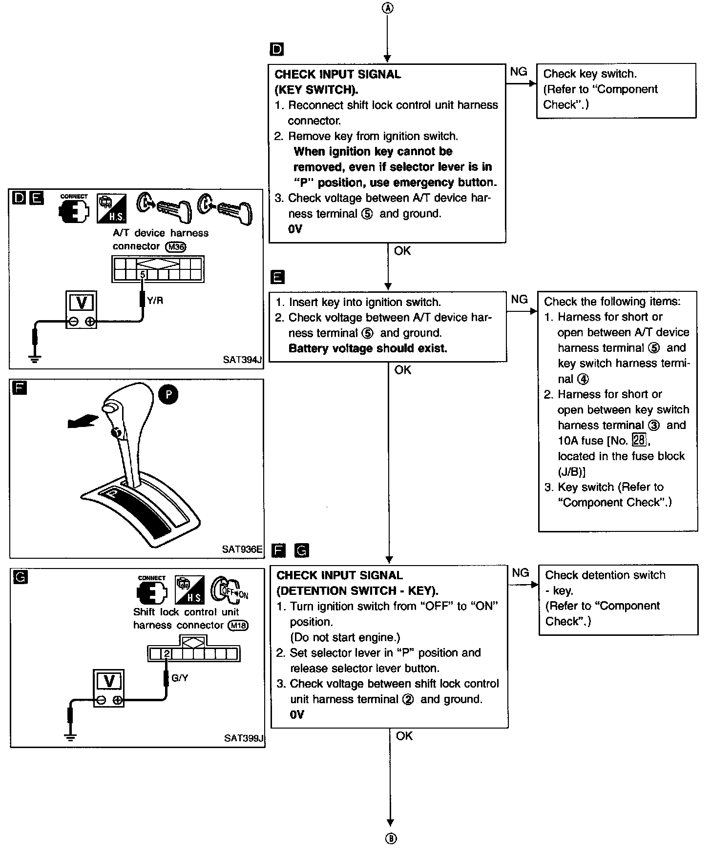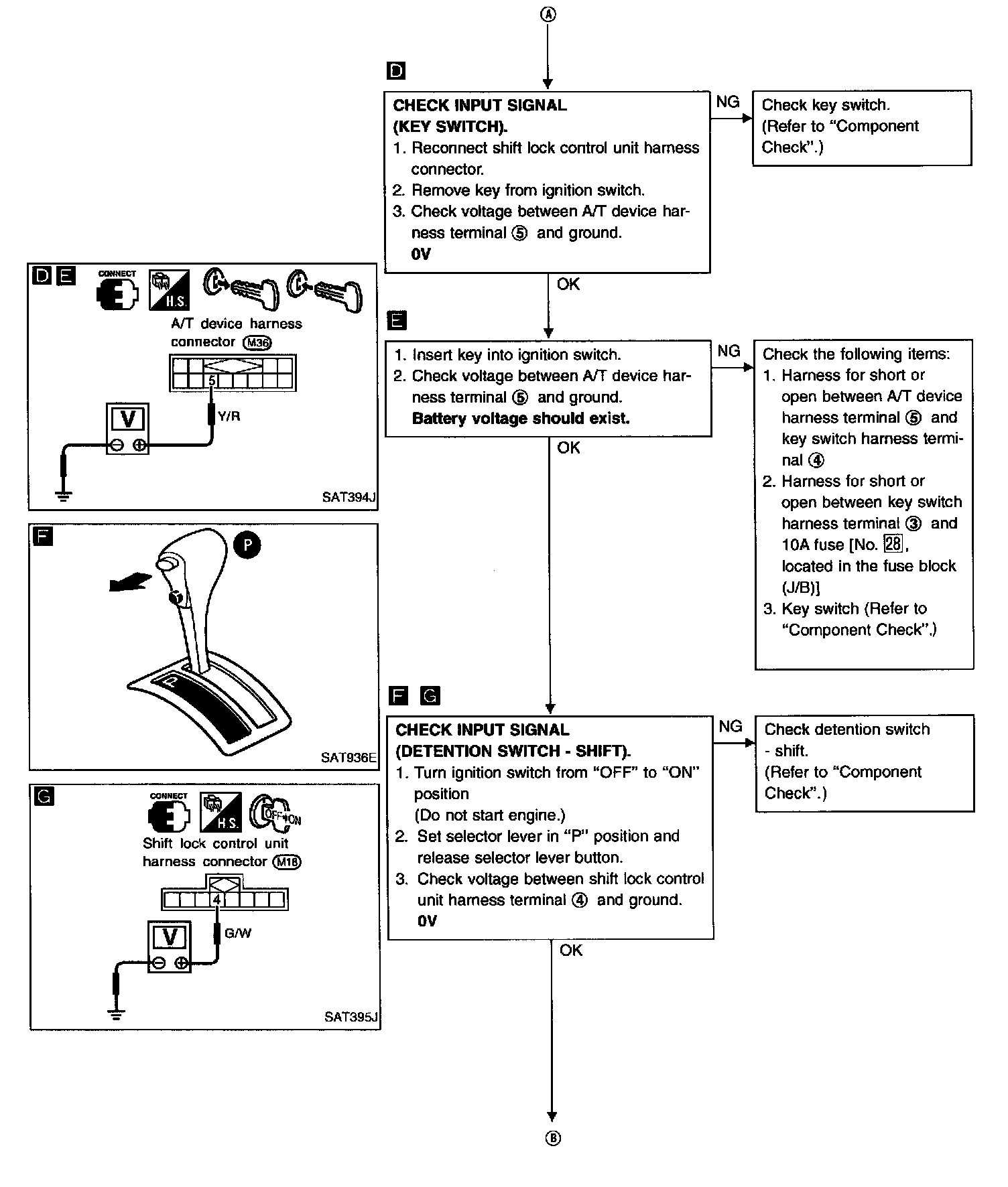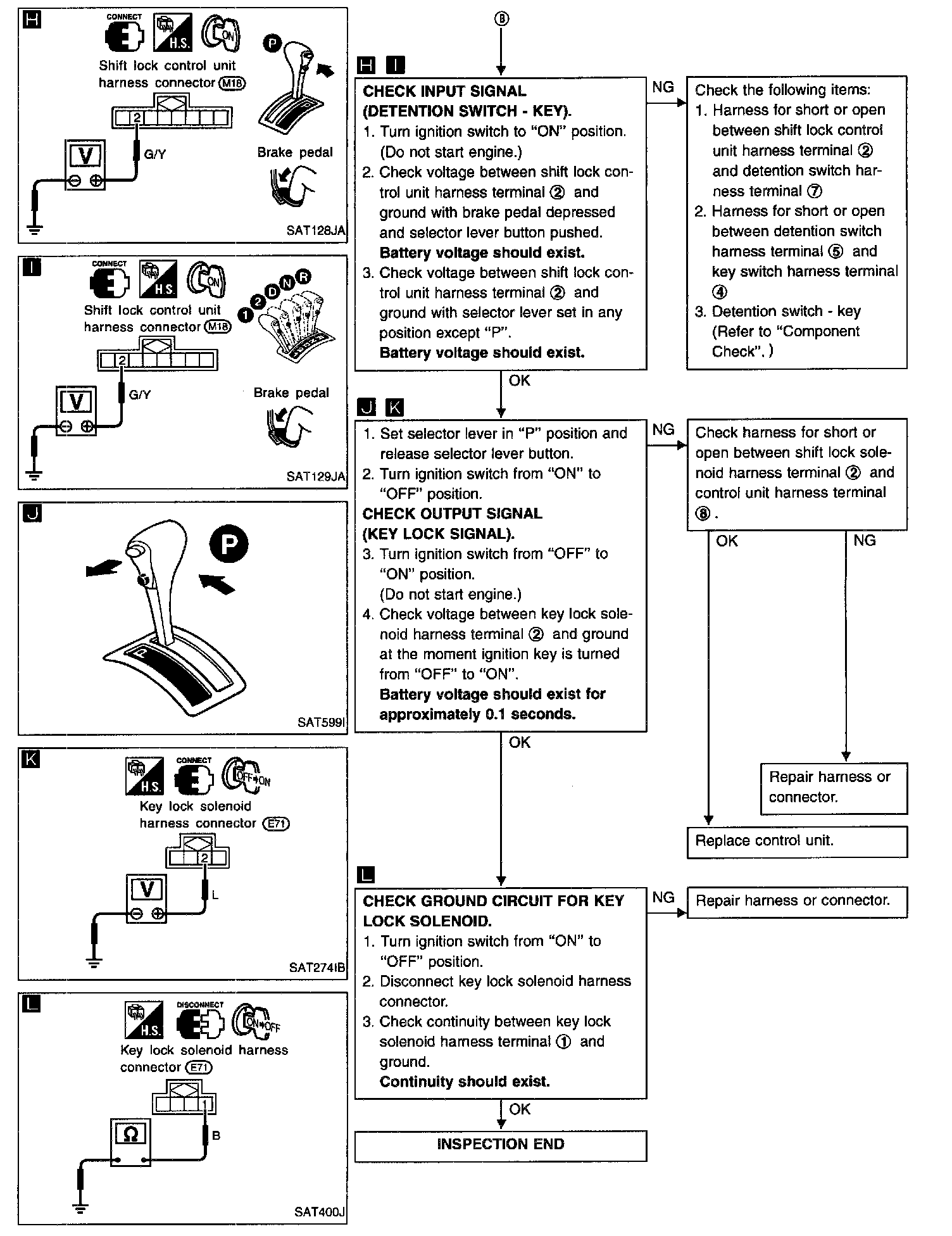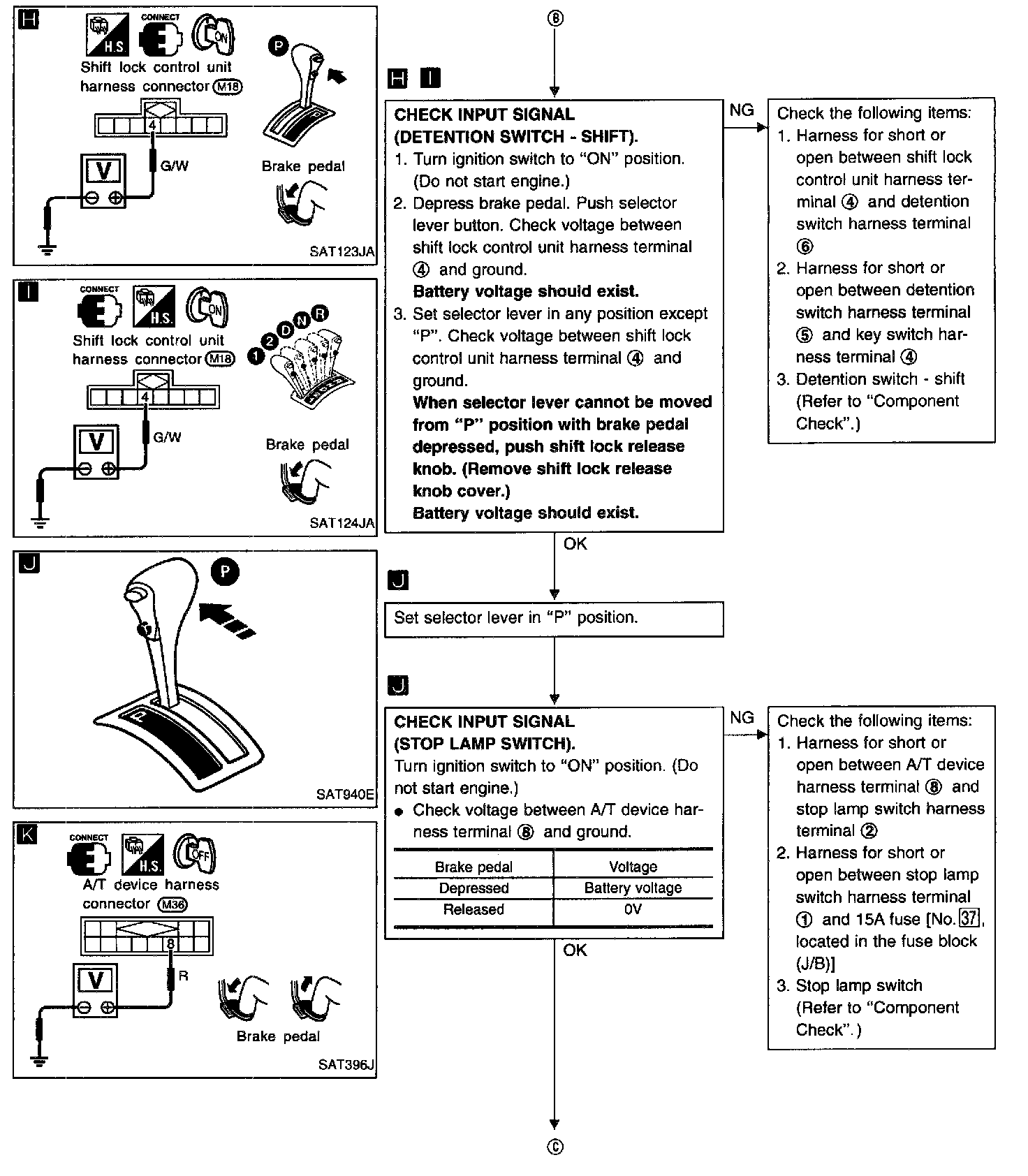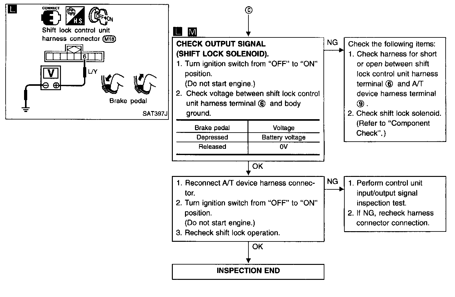- Measure voltage between each terminal by following "SHIFT LOCK CONTROL UNIT INSPECTION TABLE".