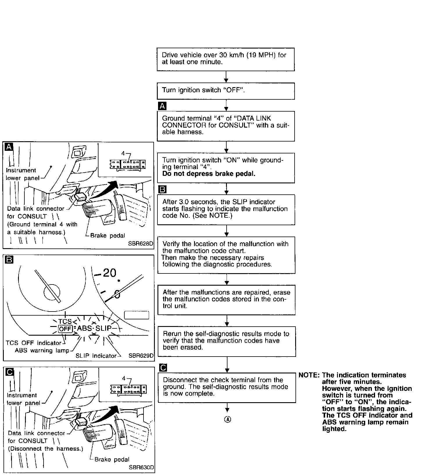 FUNCTION- When a problem occurs in the ABS, the SLIP indicator on the instrument panel comes on. To start the self-diagnostic results mode, ground the self-diagnostic (check) terminal located on "Data Link Connector for CONSULT". The location of the malfunction is indicated by the SLIP indicator flashing.