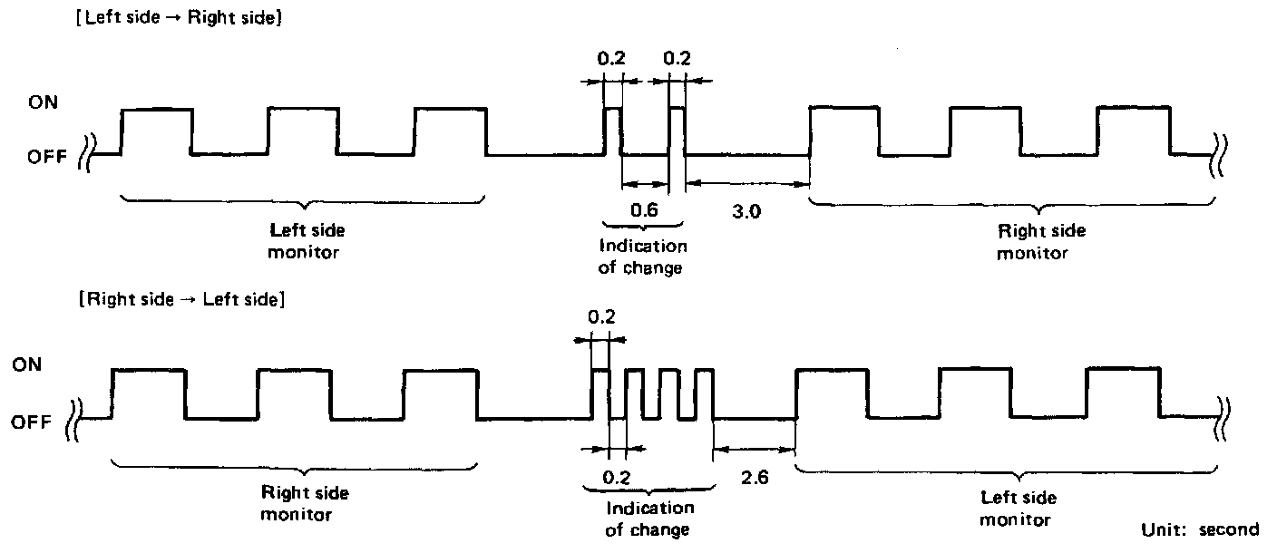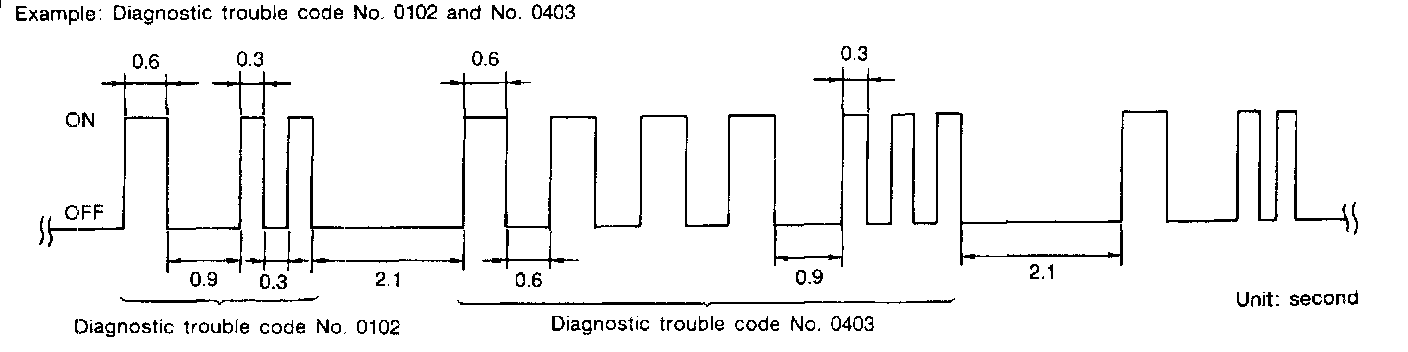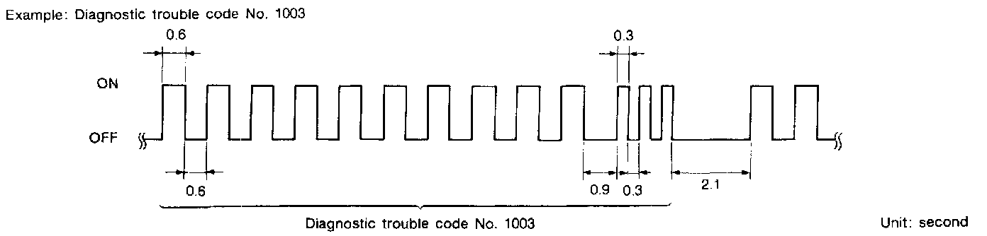 Long (0.6 second) blinking indicates the two LH digits of number and short (0.3 second) blinking indicates the two RH digits of number. For example, the malfunction indicator lamp blinks 10 times for 6 seconds (0.6 sec x 10 times) and then it blinks three times for about 1 second (0.3 sec x 3 times). This indicates the DTC "1003" and refers to the malfunction of the park/neutral position switch.