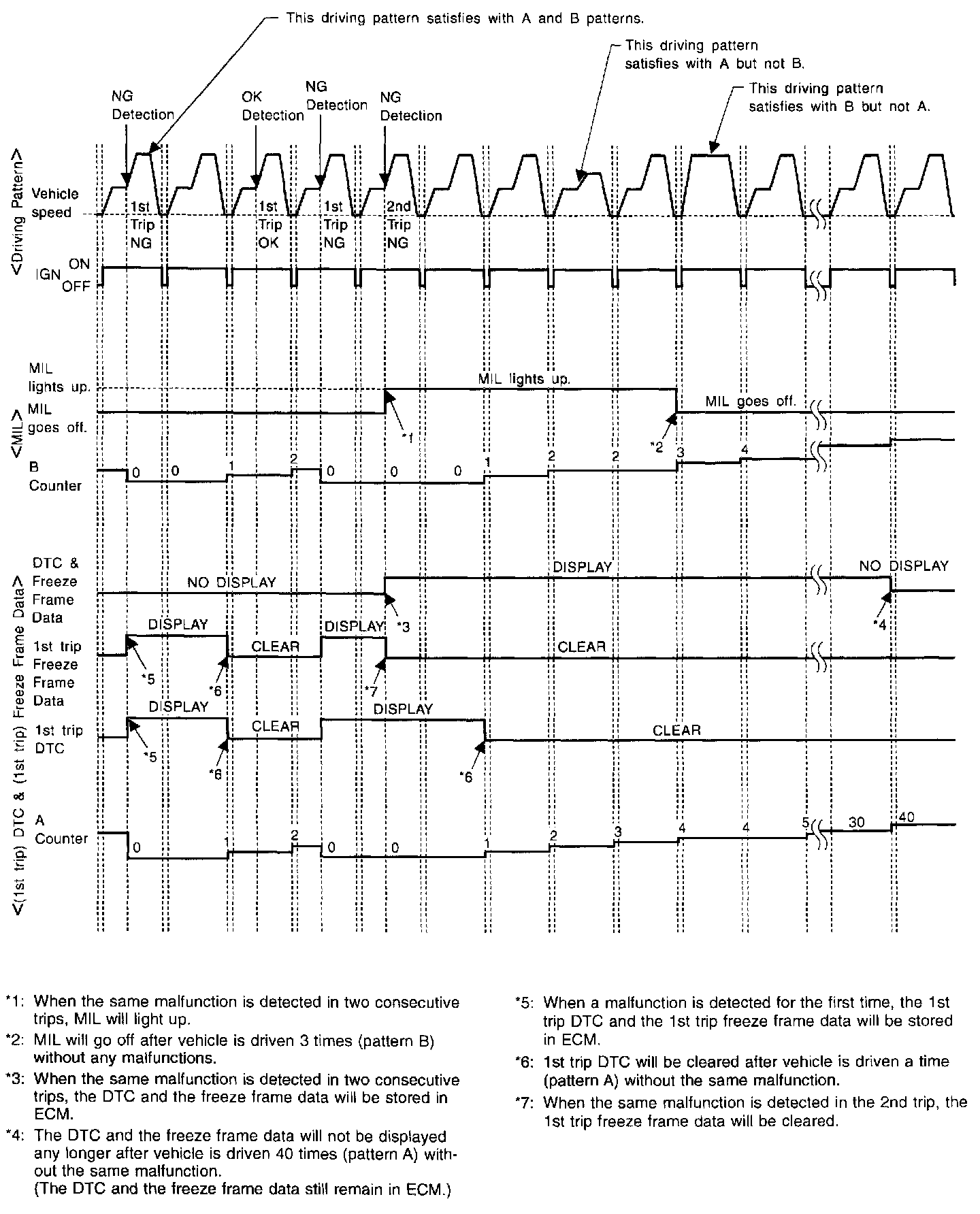 - The DTC and the freeze frame data will be stored until the vehicle is driven 40 times (driving pattern A) without the same malfunction recurring (except for Misfire and Fuel injection system). For Misfire and Fuel Injection System, the DTC and freeze frame data will be stored until the vehicle is driven 80 times (driving pattern C) without the same malfunction recurring. The "TIME" IN "SELF-DIAGNOSTIC RESULTS" mode of CONSULT will count the number of times the vehicle is driven.