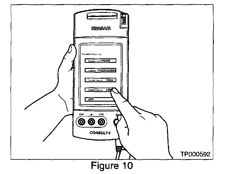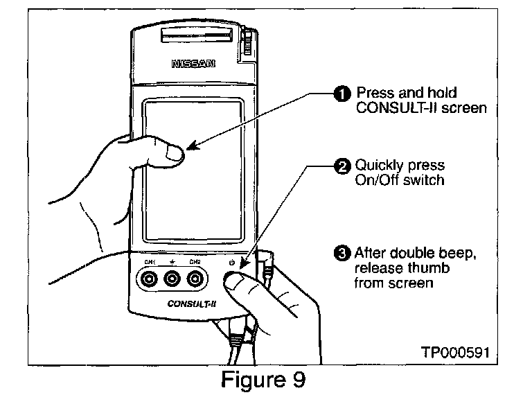 A. While pressing on the CONSULT-II screen with your thumb, quickly depress and release the ON/OFF switch (see Figure 9).