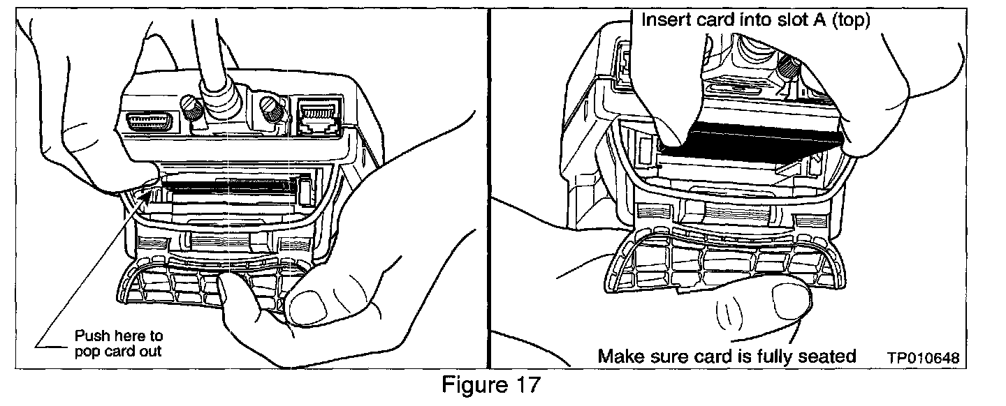 26. Remove the Diagnostics (red/white) card from slot A of CONSULT II and install the ECU Reprogramming card (orange) into slot A (see Figure 17).