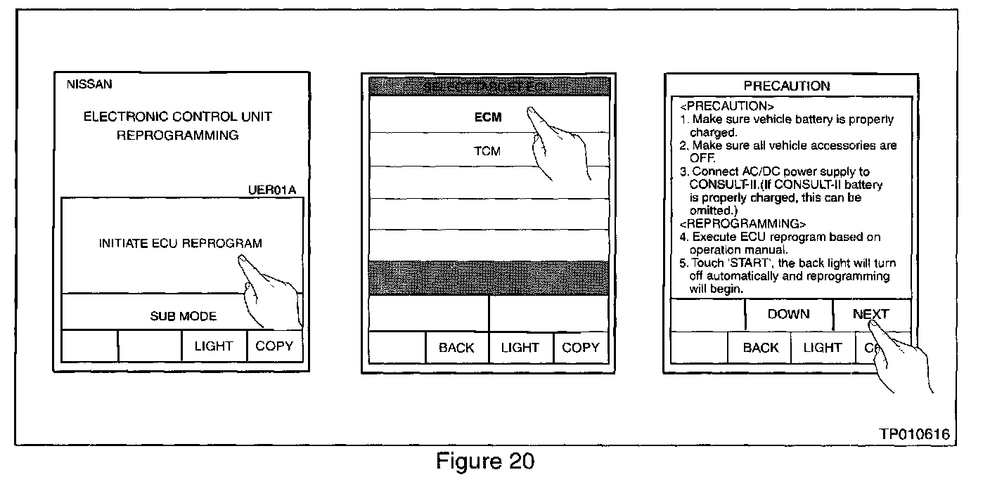 ^ Charge the CONSULT-II battery before proceeding with ECM Reprogramming