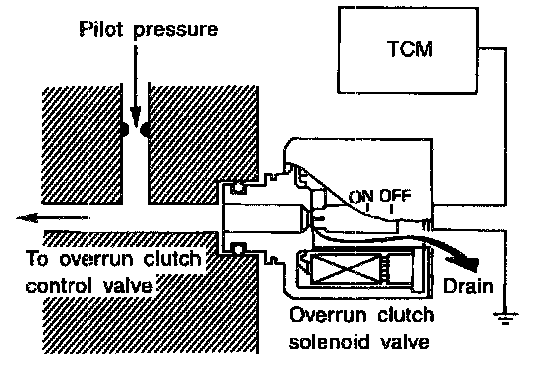 The overrun clutch solenoid valve is operated by an ON-OFF signal transmitted by the TCM to provide overrun clutch control (engine brake control).