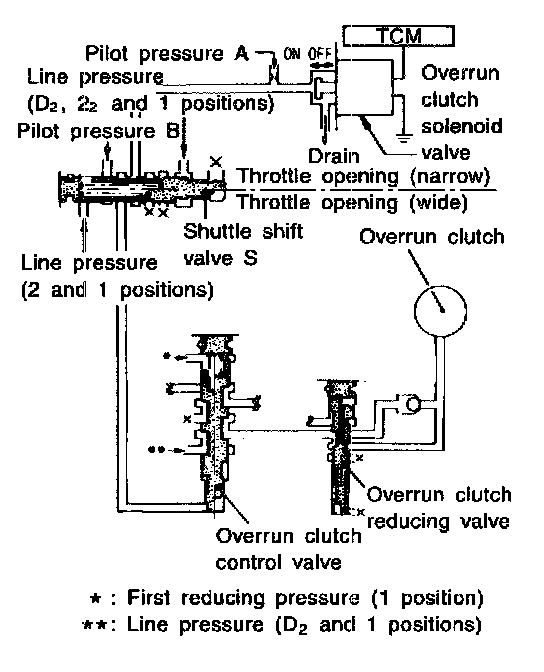 When the solenoid valve is "ON", pilot pressure A is applied to the overrun clutch control valve through shuttle shift valve S. This pushes up the overrun clutch control valve. The line pressure, which is routed by the overrun clutch reducing valve, is then shut off so that the clutch does not engage.