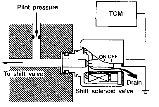 The shift solenoid valve performs simple ON-OFF operation. When set to "ON", the drain circuit closes and pilot pressure is applied to the shift valve.