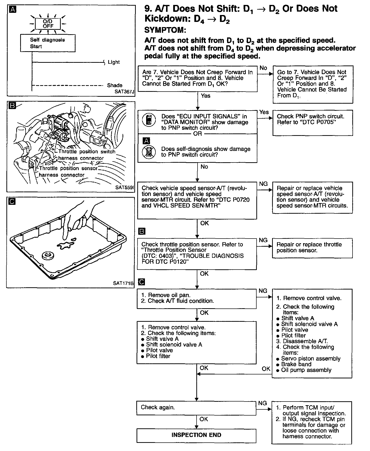 SYMPTOM: A/T does not shift from D1 to D2 at the specified speed. A/T does not shift from D4 to D2 when depressing