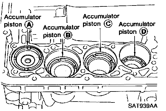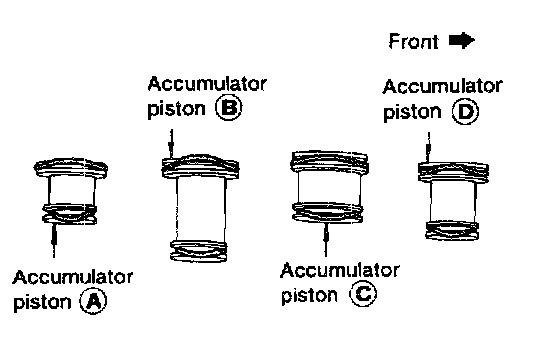 c. Install accumulator pistons (A), (B), (C) and (D).