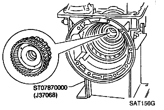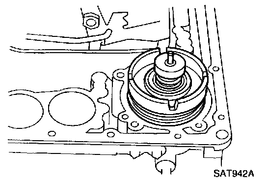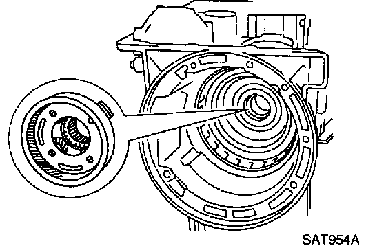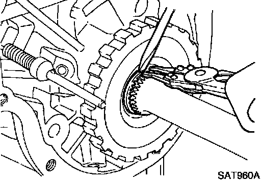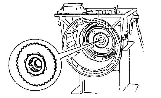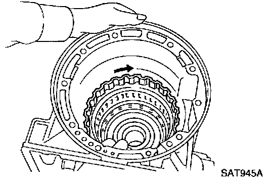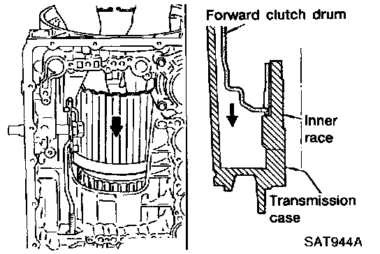 b. Slightly lift forward clutch drum assembly and slowly rotate it clockwise until Its hub passes fully over the clutch inner race inside transmission case.