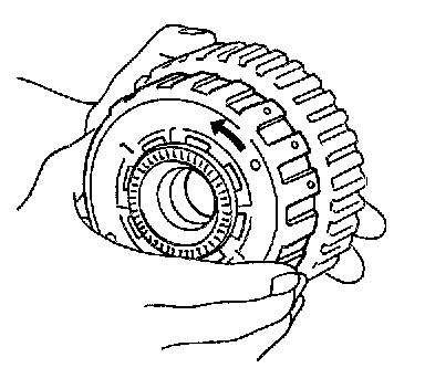 g. Check that overrun clutch hub rotates as shown while holding forward clutch hub.
