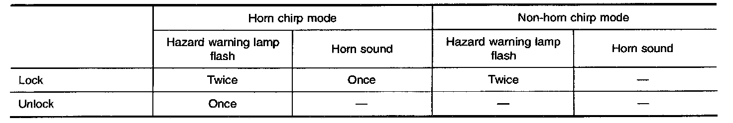 When LOCK and UNLOCK signals are sent from the remote controller for more than 2 seconds at the same time, the hazard and horn reminder mode is changed and hazard warning lamp flashes and horn sounds.
