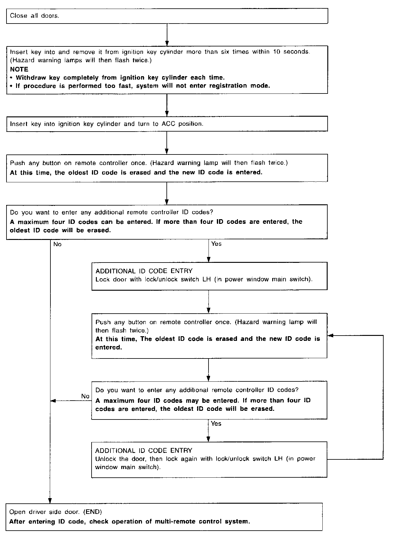 To erase all ID codes in memory, register one ID code (remote controller) four times. After all ID codes are erased, the ID codes of all remaining and/or new remote controllers must be re-registered.