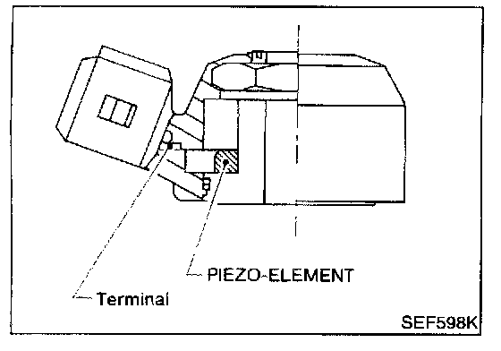 The knock sensor is attached to the cylinder block. It senses engine knocking using a piezoelectric element. A knocking vibration from the cylinder block is sensed as vibrational pressure. This pressure is converted into a voltage signal and sent to the ECM.