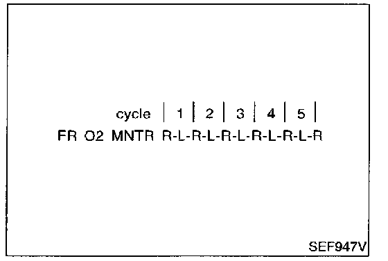 - "FR O2 MNTR-B1" in "DATA MONITOR" mode changes from "RICH" to "LEAN" to "RICH" 5 times in 10 seconds.