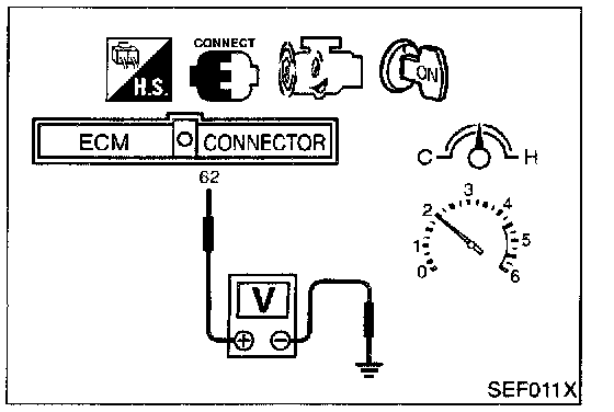 2. Set voltmeter probes between ECM terminal 62 (Front heated oxygen sensor signal) and engine ground.