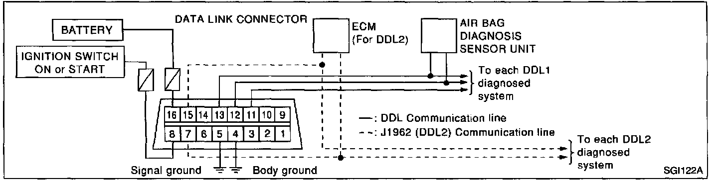 NOTE: The DDL1 and DDL2 circuits from DLC pins 12, 13, 14 and 15 may be connected to more than one system. A short in a DDL circuit connected to a control unit in one system may affect CONSULT-II access to other systems.