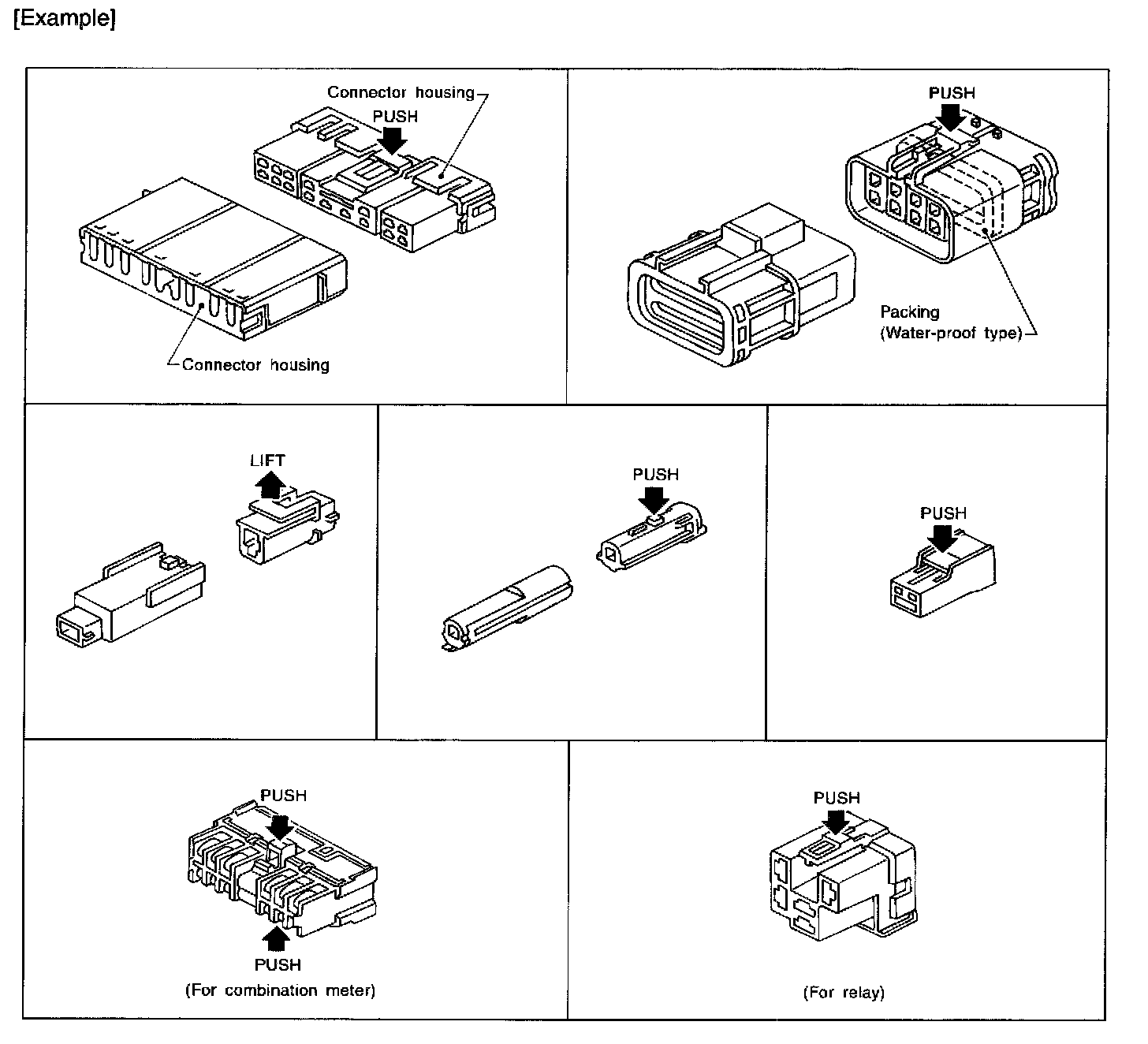 - The tab-locking type connectors are disconnected by pushing or lifting the locking tab(s). Refer to the illustration.