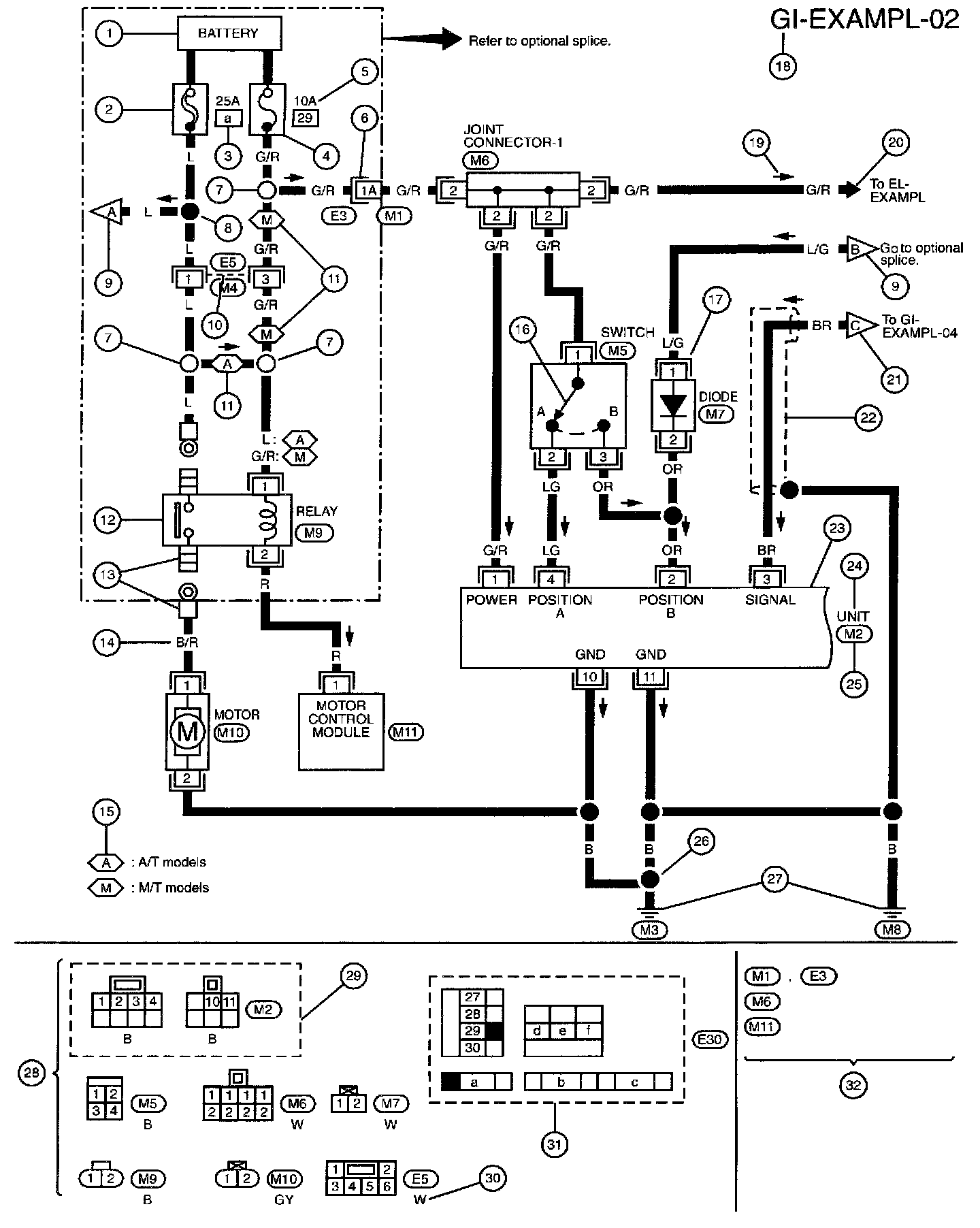 - Connector numbers in a single circle M33 indicate harness connectors.