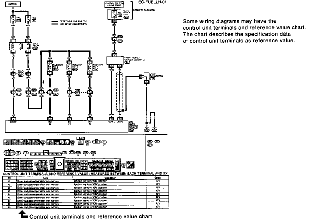 - A line with regular weight (wider line) represents a "detectable line for DTC (Diagnostic Trouble Code)". A "detectable line for DTC" is a circuit in which ECM (Engine Control Module) can detect its malfunctions with the on board diagnostic system.