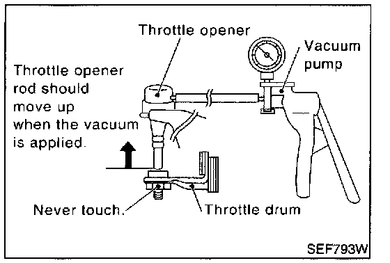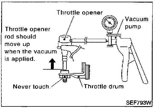 5. Apply vacuum [more than -40.0 kPa (-300 mmHg, 11.81 inHg)] until the throttle drum becomes free from the rod of the throttle opener.