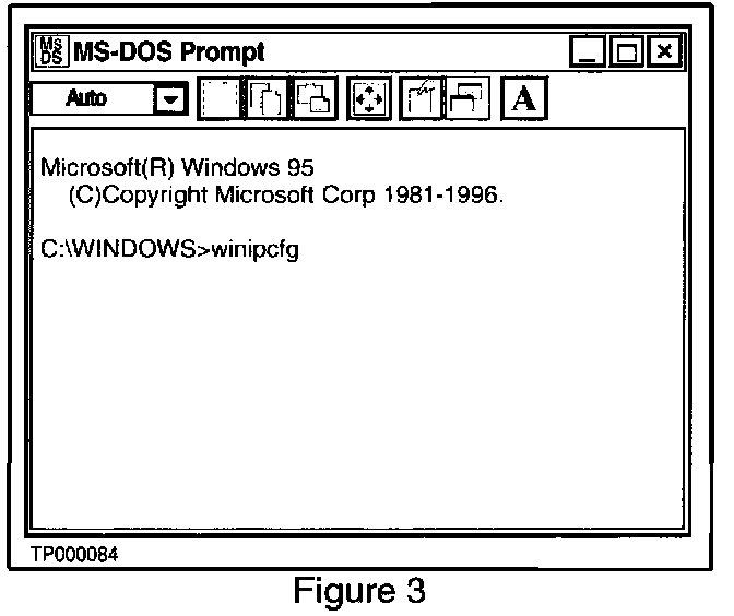 B. When the MS-DOS Prompt window appears, after C:\WINDOWS> type: winipcfg (see Figure 3).