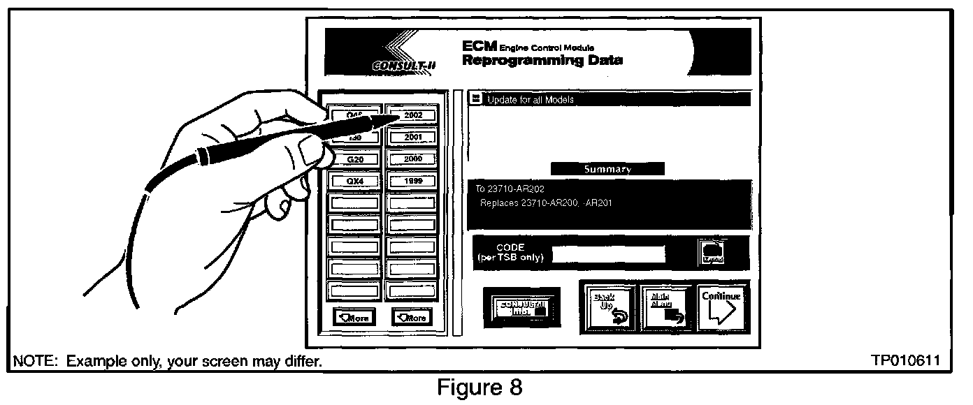 ^ Use CONSULT-II to install the ECM Reprogramming data into the vehicle ECM.