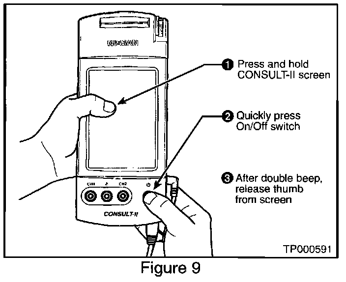 A. While pressing on the CONSULT-II screen with your thumb, quickly depress and release the ON/OFF switch (See Figure 9).