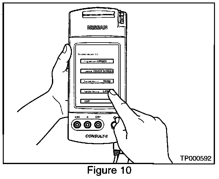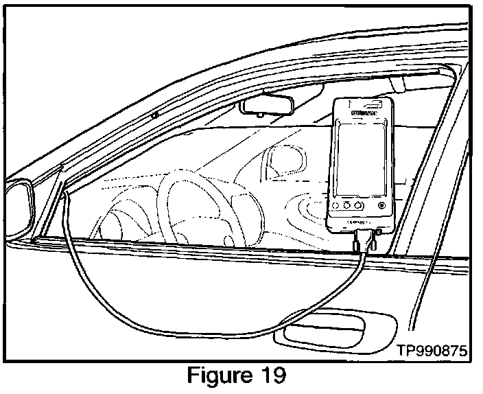 29. Roll down the driver's window part way, exit the vehicle, close the door and hang the CONSULT II unit on the outside of the window (see Figure 19).