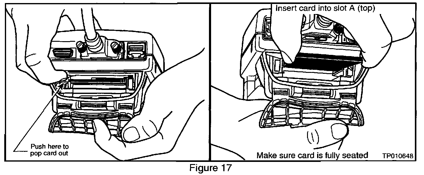 26. Remove the Diagnostics (red/white) card from slot A of CONSULT II and install the ECU Reprogramming card (orange) into slot A (see Figure 17).