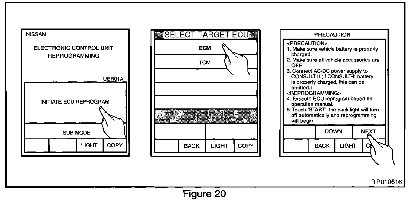^ Charge the CONSULT-II battery before proceeding with ECM Reprogramming