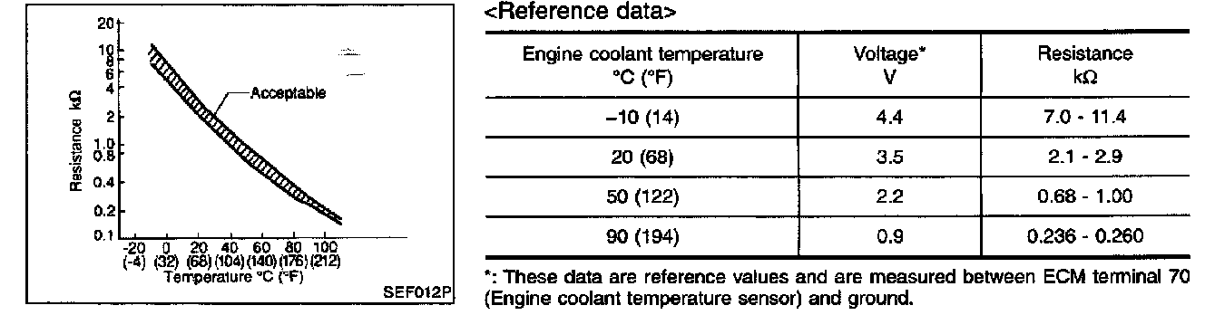 The engine coolant temperature sensor is used to detect the engine coolant temperature. The sensor modifies a voltage signal from the ECM. The modified signal returns to the ECM as the engine coolant temperature input. The sensor uses a thermistor which is sensitive to the change in temperature. The electrical resistance of the thermistor decreases as temperature increases.