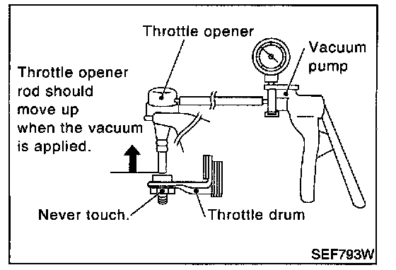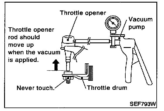 5. Apply vacuum [more than -40.0 kPa (-300 mmHg, 11.81 inHg)] until the throttle drum becomes free from the rod of the throttle opener.