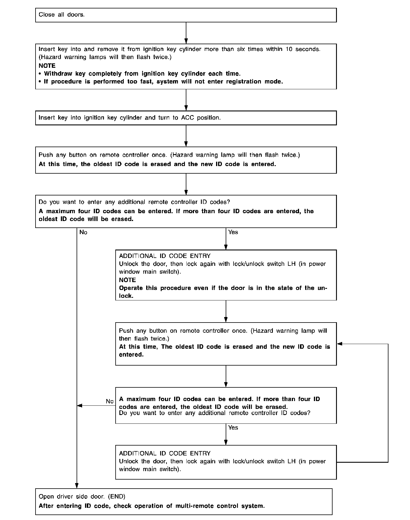 To erase all ID codes in memory, register one ID code (remote controller) four times. After all ID codes are erased, the ID codes of all remaining and/or new remote controllers must be re-registered.
