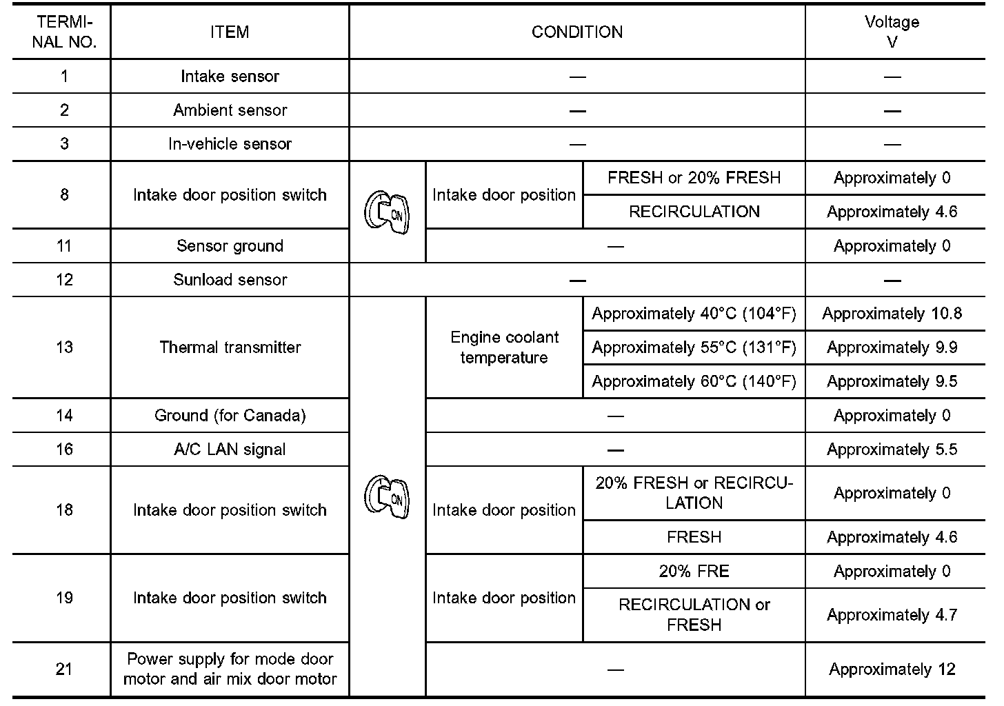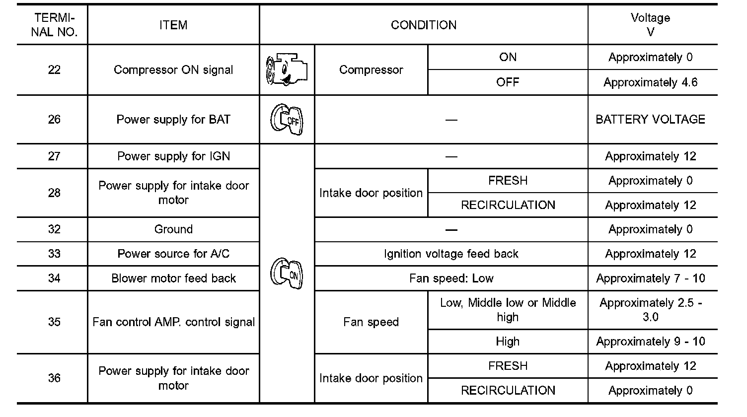 Measure voltage between each terminal and body ground by following "AUTO AMP. INSPECTION TABLE".