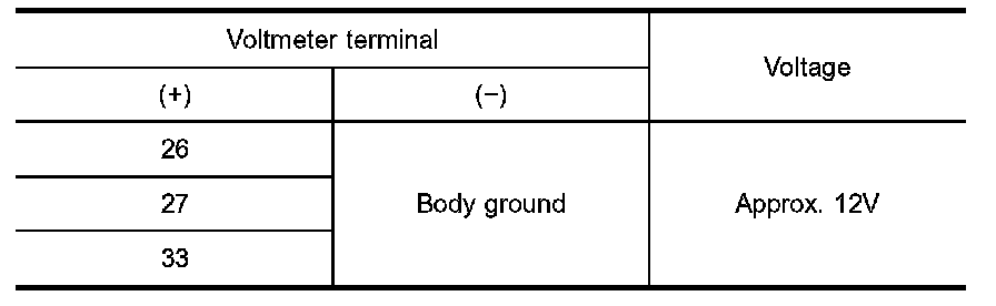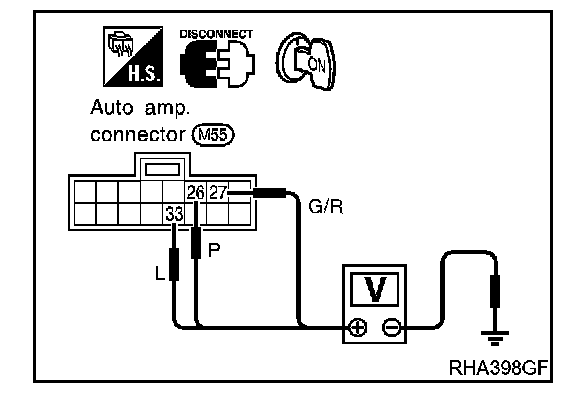 Check power supply circuit for auto amp. with ignition switch ON. Measure voltage across terminal Nos. 26, 27, 33 and body ground.