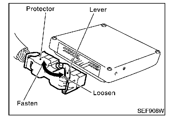 - When connecting ECM harness connector, fasten it securely with a lever as far as it will go as shown.